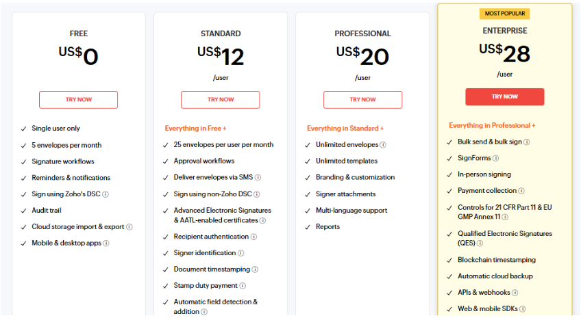 The Free Plan includes 5 envelopes/month with basic features like reminders and cloud storage. The Standard Plan ($12/user) adds more envelopes, authentication, and integrations. The Professional Plan ($20/user) offers unlimited envelopes, branding, and reporting. The Enterprise Plan ($28/user) includes advanced features like bulk send, payments, APIs, and white labeling.