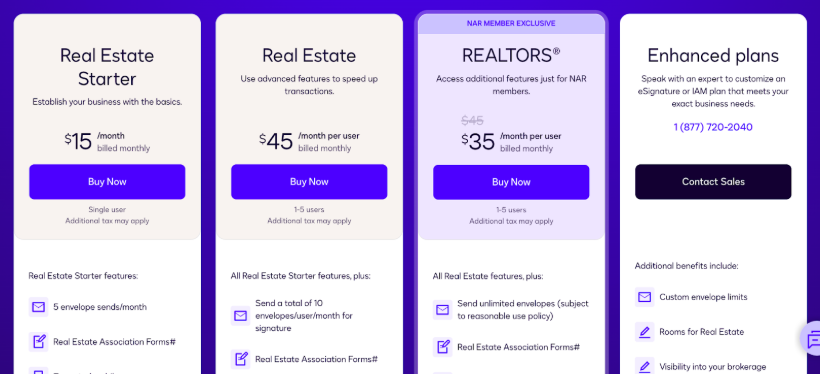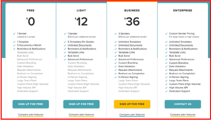 We offer a limited free plan, a Light ($12/month) plan for individuals with light e-signing needs, a Business ($36/month) plan for small businesses and real estate firms, and an Enterprise plan for power users. All paid plans allow for unlimited signed documents each month.