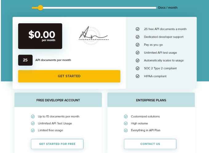 Our API pricing is straightforward, too. It’s pay-as-you-go, and you can send your first 25 API documents each month free of charge!
