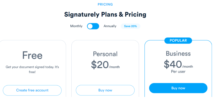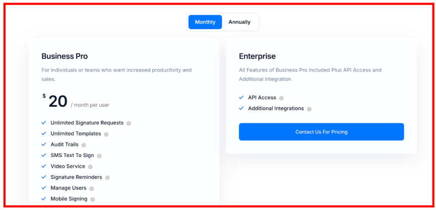 WeSignature has two plans – Business Pro ($20/month/user), and Enterprise (Custom), including API access and advanced integration.