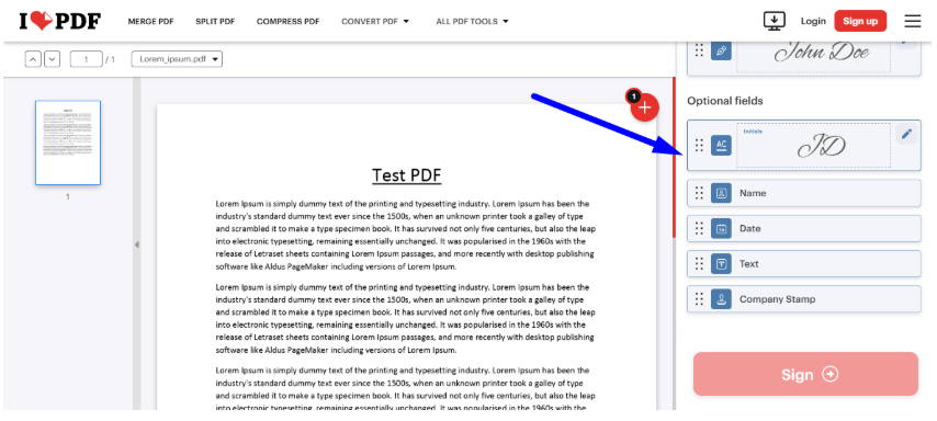 - Drag and Drop: From the left panel, drag the Initials field into your document to position it where your signature is required.