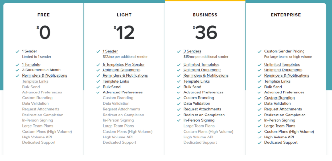 - Business Plan ($36/month): 3 senders, unlimited templates and documents, custom branding, data validation, in-person signing, and comprehensive team management features.
